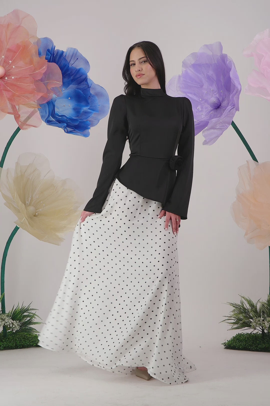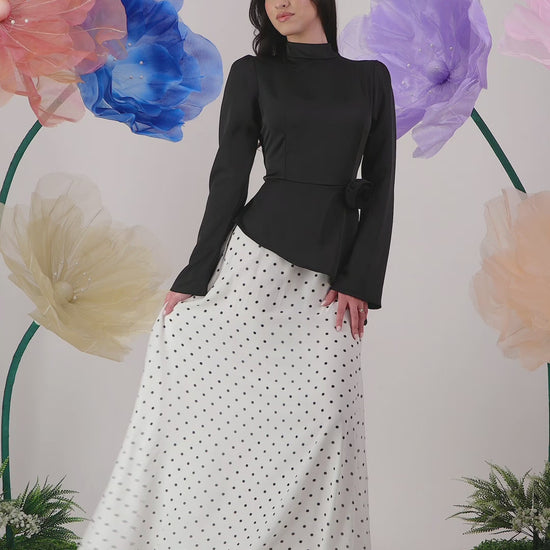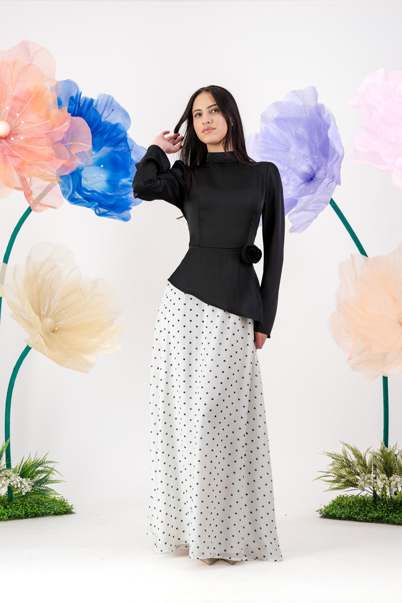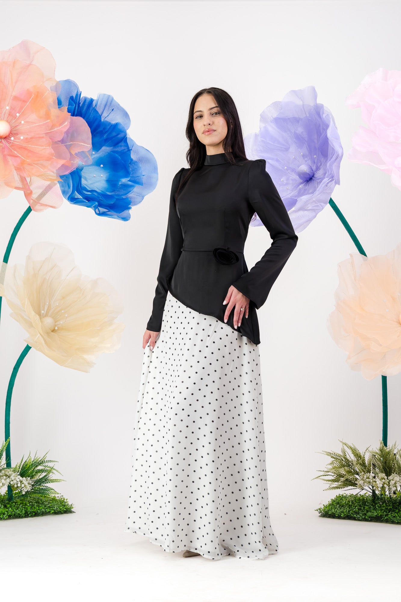PRODUCT DETAILSA modern take on our beloved Elara dress - now with a playful polka dot chiffon skirt. Clean tailoring meets soft movement.