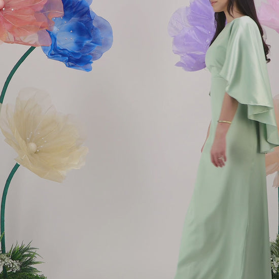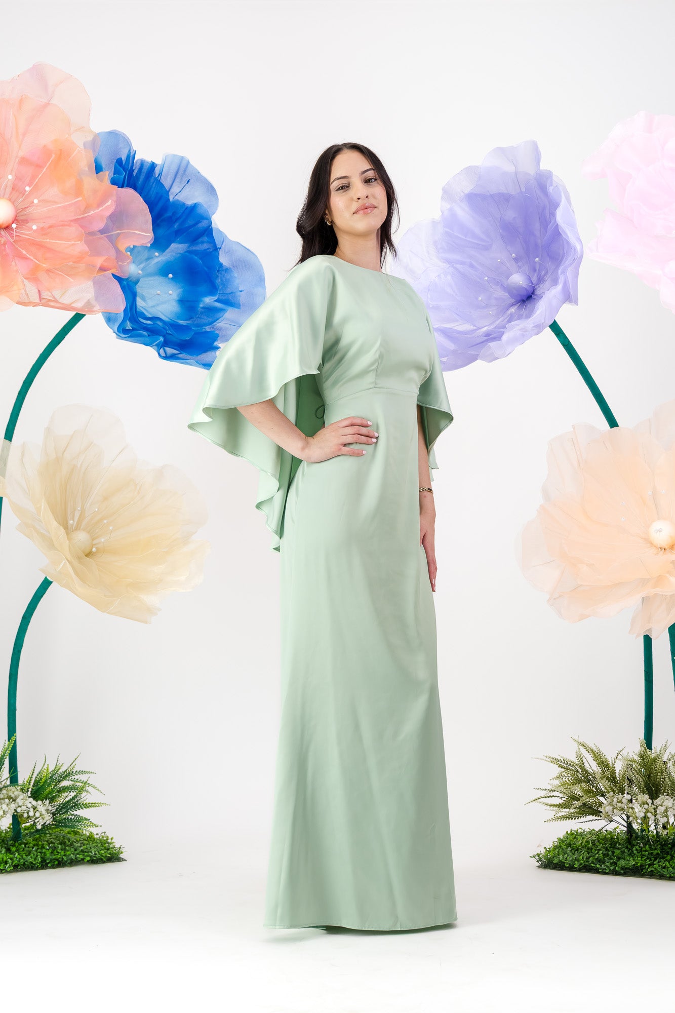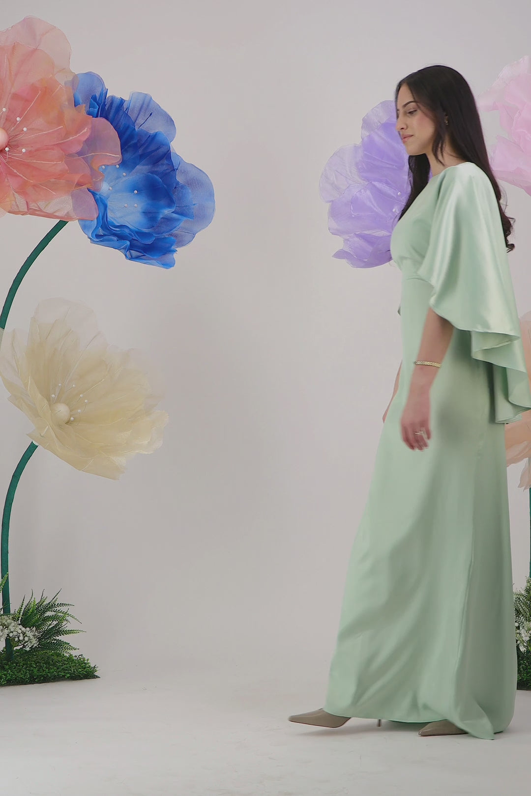 A summery satin gown with a sculpted sleeveless bodice and a soft draped cape overlay that frames the arms with quiet elegance. Feminine, floaty, and modern - Roya brings a fresh, polished silhouette perfect for daytime weddings and Eid.